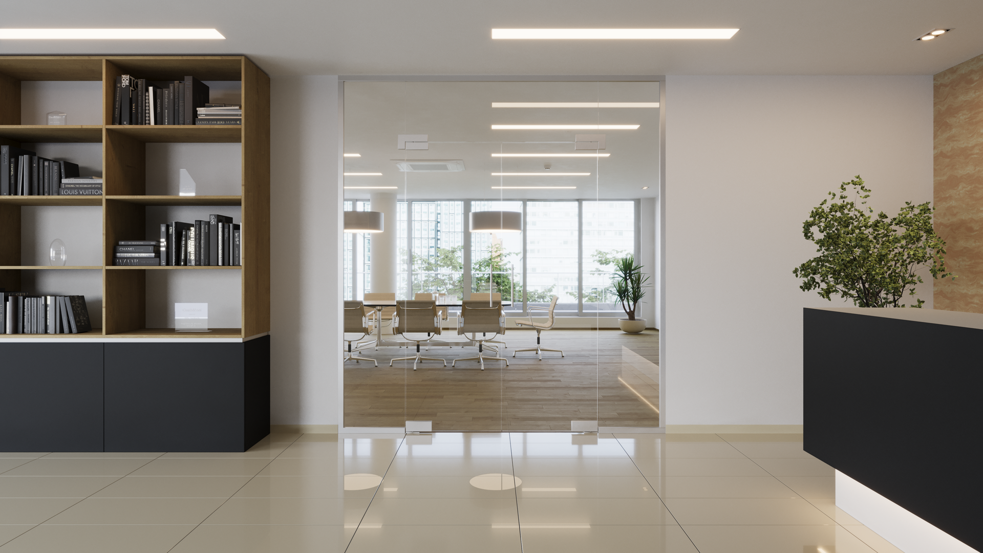 Moderne Glastrennwand schafft Transparenz und klare Strukturen im Raum.